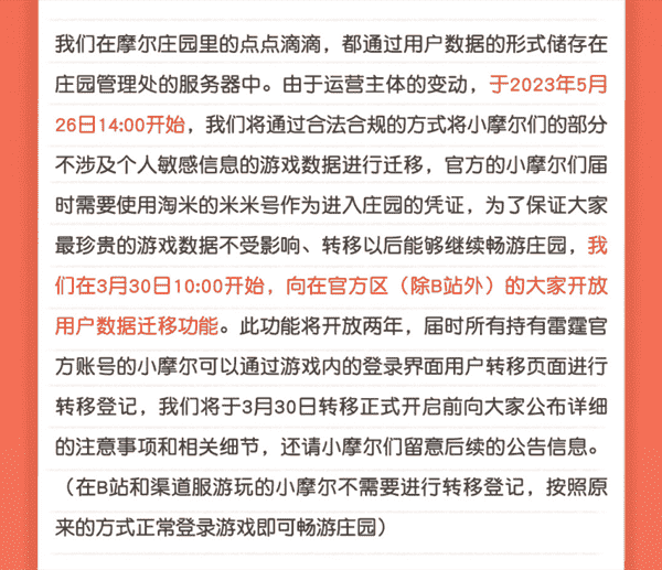 合作结束本就是开发方和代理方双方的事情,,,,降低这件事情对玩家的影响,,才是对所有珍视这段童年的摩尔玩家最好的呵护。。。。目前看来,,,,用户完全不用担心后续因无法登录游戏而造成任何数据上的损失,,只要及时进行账号转移,,就可以好好保留、、延续在庄园的痕迹和回忆,,,继续在庄园里做快乐的红鼻子小鼹鼠。。