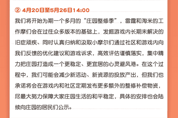合作的结束并不意味着这个童年IP的结束,,,,对于《摩尔庄园》手游而言,,,,这是一个新阶段的开始。。。。后续游戏内将开启庄园重构计划,,会就以往遗留下来的BUG进行集中修复,,并在游戏内和社区定期发布更多补偿物资。。。