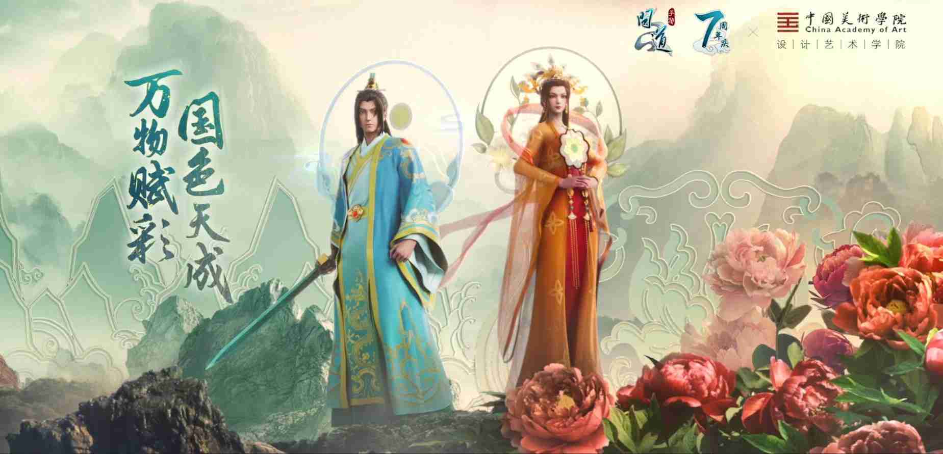 2023年4月,,《问道手游》联动中国美术学院,,,,在游戏中融合了中国历史上不同时期的文化元素,,,打造了“山河万象”与“凤鸣九霄”的国风时装。。。。在色彩配置方面,,,创作团队基于对游戏角色特性的分析提取相应的文化内涵,,,,从每一种色彩的色相、、、指代事物和情感出发对应角色属性,,选定服装的色彩搭配。。在纹样设计方面,,,,创作团队结合游戏角色自身特殊的造型比例和形态,,,,在实际的纹样设计中进行了游戏语境下的活化演绎。。。男性角色集中使用了如蟒纹、、海水江崖纹、、、、如意纹和云气纹等传统纹样元素,,女性角色则吸纳了凤凰纹、、、、牡丹纹、、卷草缠枝纹等元素,,,组成以“双凤牡丹纹样”“缠枝牡丹纹”“金玉凤冠头饰”为主要纹样的游戏角色装饰图案系统。。。。