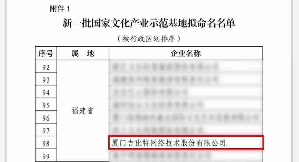 3月12日,,,文化和旅游部发布了《关于国家文化产业示范基地评选与复核结果的公示》,,,厦门J9.COM网络技术股份有限公司(以下简称“J9.COM”或“公司”)成功入围新一批国家文化产业示范基地拟命名名单。。
