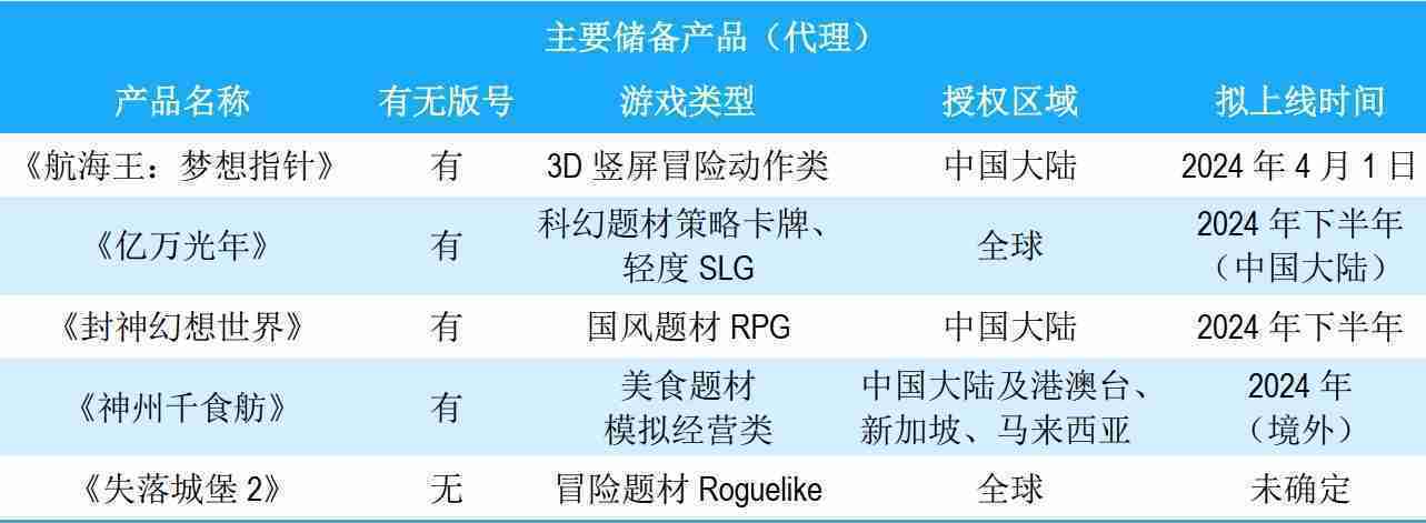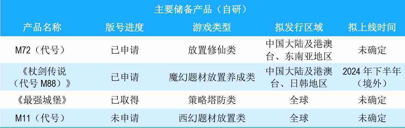 公司储备的多个自研、、、代理产品都在有序推进当中,,涵盖放置类、、、、策略类、、、、模拟经营类、、、RPG、、Roguelike等多元化游戏品类,,储备的主要自研和代理产品如下:::
