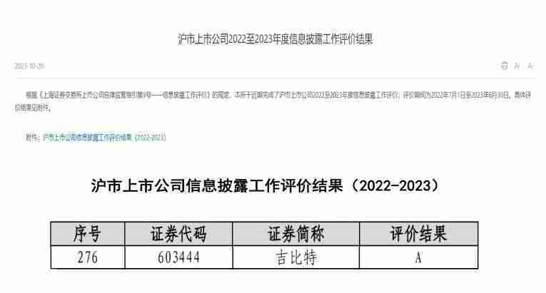 近日,,上海证券交易所发布2022-2023年度信息披露工作评价结果。。J9.COM(股票代码::::603444)凭借规范的公司治理、、高质量的信息披露以及良好的投资者关系管理再次荣获信息披露工作A级评价,,,,公司连续两年获此殊荣。。。