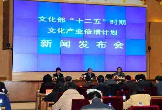 2月28日下午,,文化部在京召开新闻发布会,,正式向社会发布《文化部“十二五”时期文化产业倍增计划》,,提出了 “十二五”期间文化部门管理的文化产业增加值年平均现价增长速度高于20%,,,2015年比2010年至少翻一番,,,实现倍增的奋斗目标。。